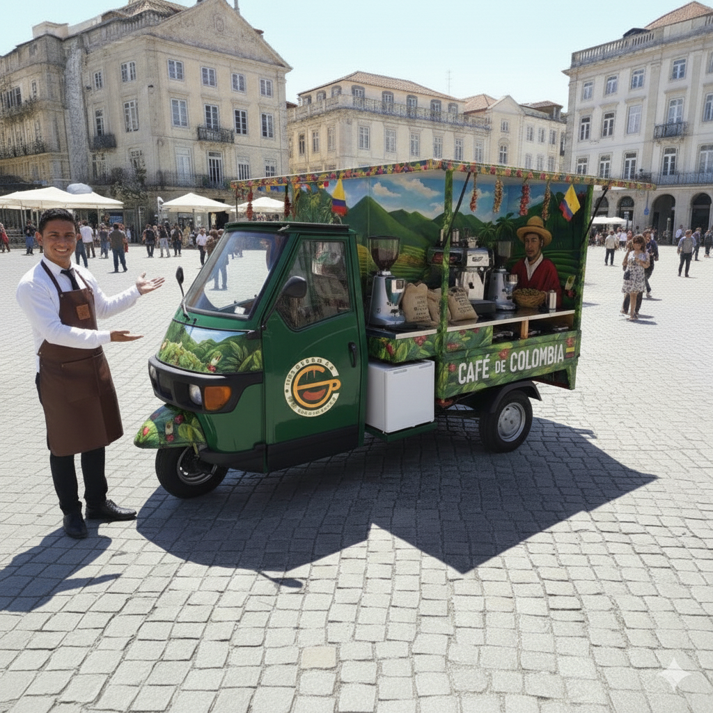 El carrito se basa en un vehículo ligero tipo Piaggio Ape o similar, adaptado como cafetería móvil con una inversión total estimada entre 18.100 € y 35.600 €, incluyendo vehículo, adaptación básica, equipamiento y capital de trabajo inicial. El equipamiento típico contempla una máquina de espresso semi-profesional, molino de café, pequeña nevera/congelador para leche y refrigerios, sistema de agua y desagüe, utensilios y tazas (desechables o reutilizables) y vinilado/diseño gráfico llamativo que resalta los colores y la alegría colombiana.